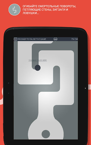 Правила игры очень просты: перед вами на экране появится белая непрерывно движущаяся дорожка, на которой необходимо удерживать палец как можно дольше. Однако это совсем не так просто, как кажется! Дорожка будет делать внезапные повороты и изгибы, а вы рискуете коснуться стенок бегущего лабиринта. Избегайте ловушек на пути, будьте предельно внимательны и осторожны! Игра практически бесконечна, а рисунок ее лабиринта никогда не повторяется.