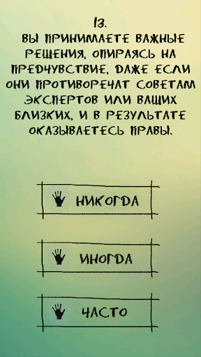 Вам предстоит ответить на ряд заданных вопросов, выбирая один из предложенных трех вариантов ответа, который наиболее подходит в вашем случае. Вопросы будут касаться в основном различных жизненных ситуаций и ваших способов их разрешения. По окончании прохождения данного теста вы сможете узнать, насколько сильно развита ваша интуиция.